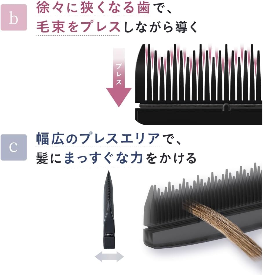 独自形状の歯でくせを段階的に伸ばす! 幅広い入口から徐々に狭くなる形状でうねった毛束を導き、プレスする面積が徐々に広くなる独自の歯の形状で髪をいたわりながらストレートに梳かします