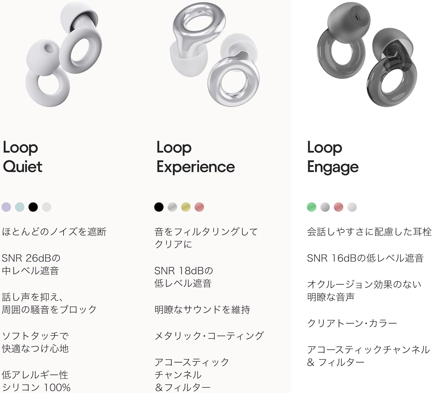 パーフェクト フィット - Loopの耳栓はすべて、スタイルと最高の快適さの両方を考慮し設計されています。正しく装着すれば、どなたの耳にもフィットします。パッケージには 4サイズのイヤチップが付属。耳栓がきつい、あるいは不快に感じる場合は、小さいサイズを試してみてください。フィット感がなく、音を十分に軽減できない場合は、ワンサイズ上のチップをお試しください。