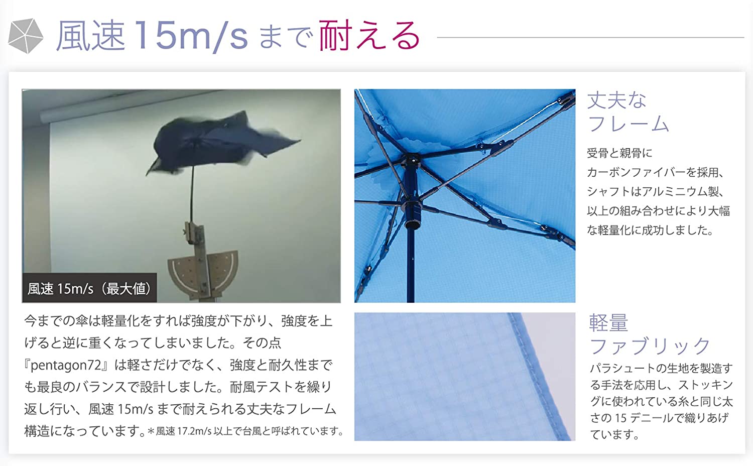 風速15m/sまで耐えられる耐風フレーム構造で、軽さと丈夫さを両立したウルトラライトアンブレラ